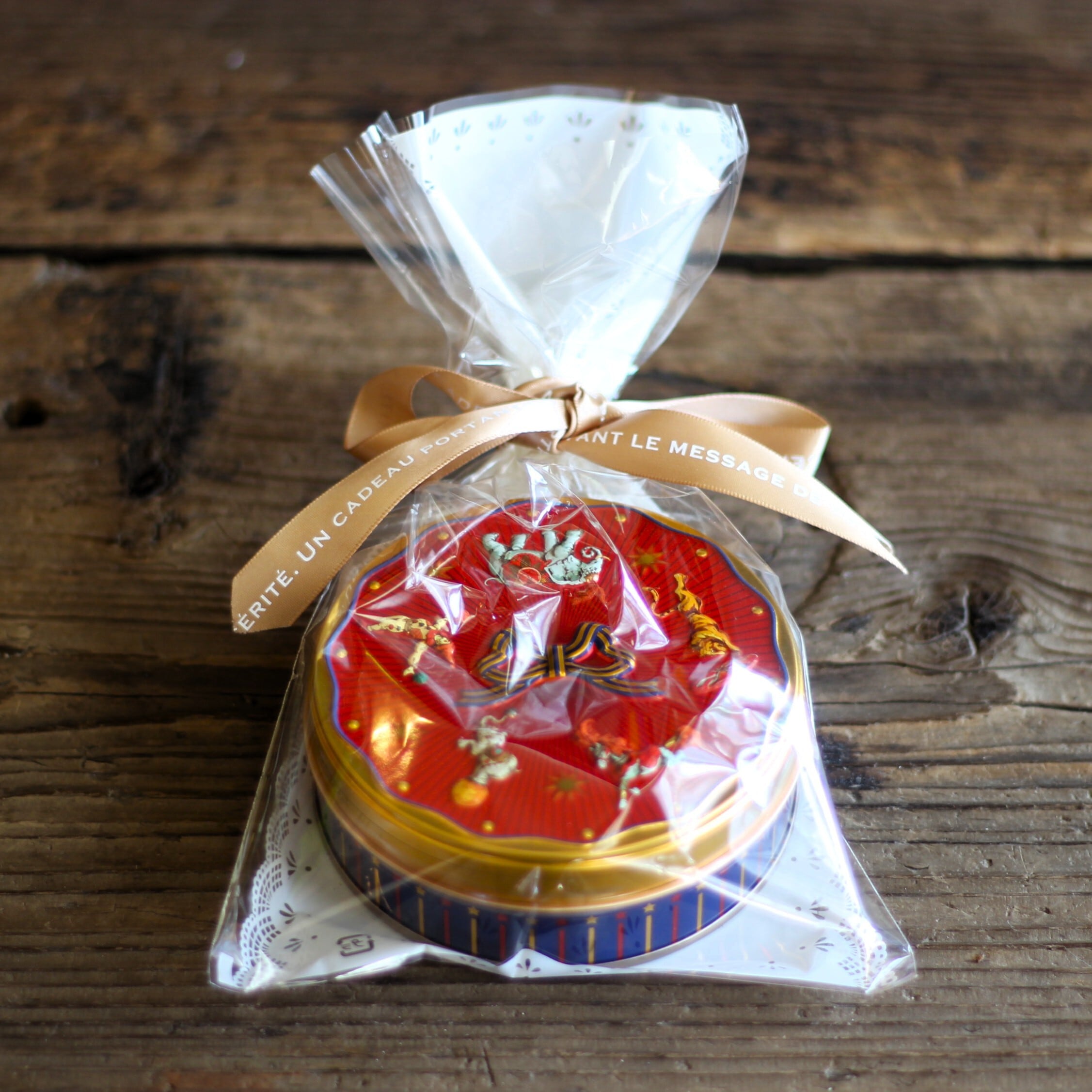 遊び心のあるサーカス柄の缶は、可愛らしさの中にどこかクラシカルな雰囲気を持ち、ギフトとしても印象に残る佇まいです。